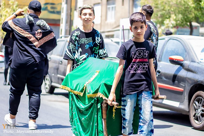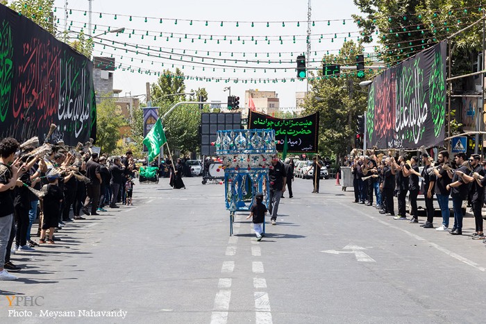 مراسم عزاداری ظهر عاشورا با حضور هیات ها و مشتاقان سرور و سالار شهیدان در محله مجیدیه شمالی تهران برگزار شد.